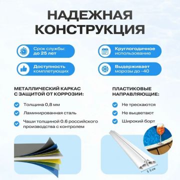 - Всесезонная эксплуатация – не требует разбора на зиму и полного слива воды.