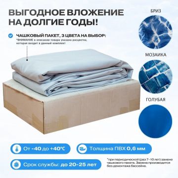 Комплектация:в комплекте: каркас, скиммер универсальный настенный, чаша 0.6 мм (голубая/бриз/мозаика - на выбор) p>