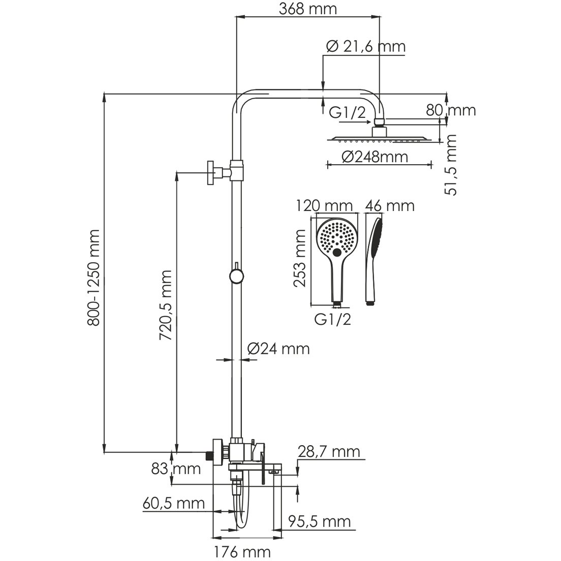 Стойка для душа, Ø 24 мм регулируемая по высоте