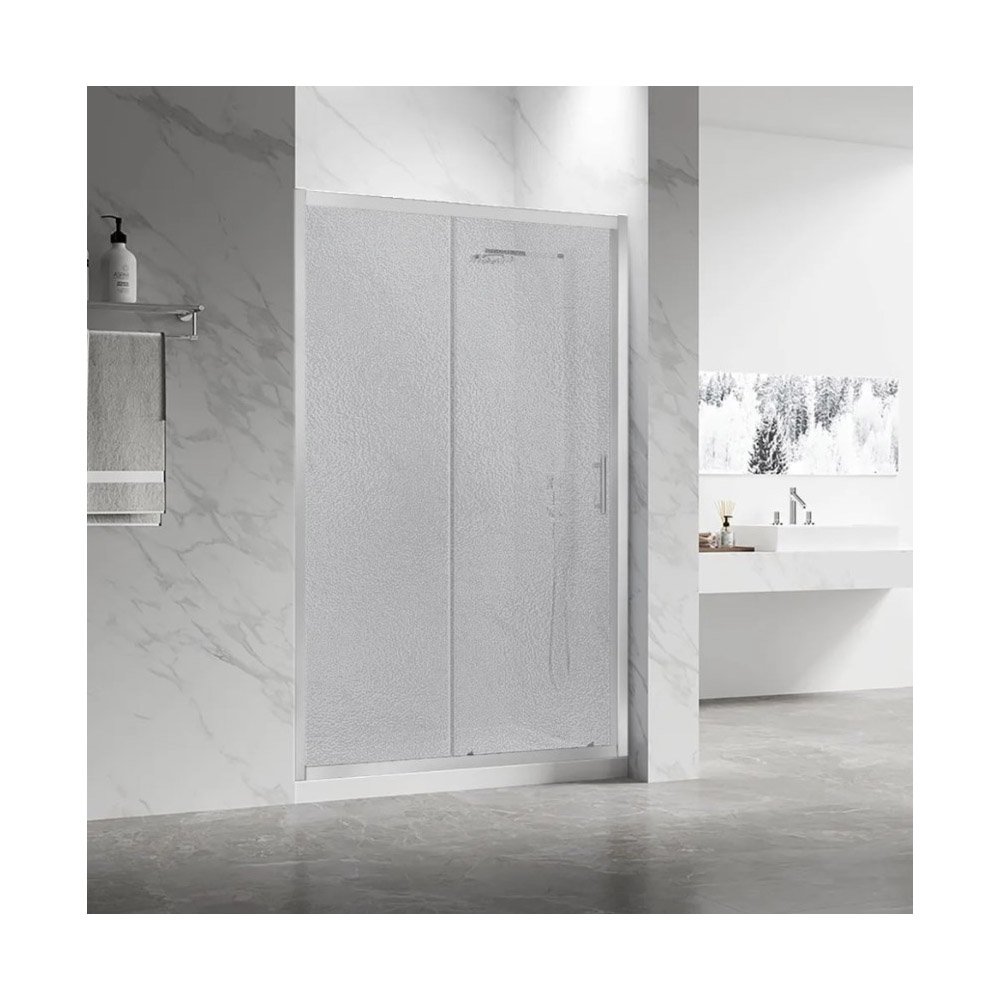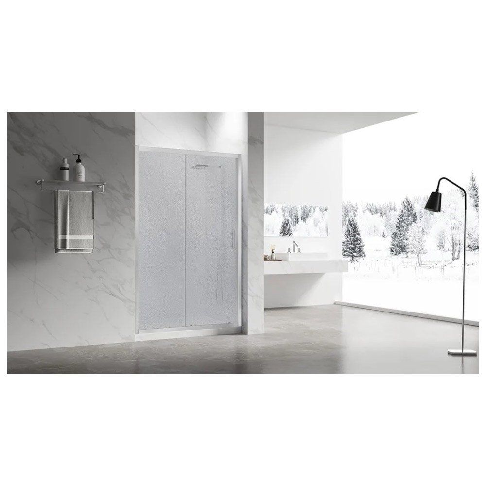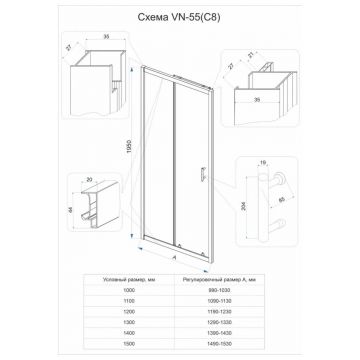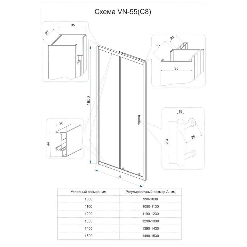 Душевая дверь Veconi Vianno VN-55. Раздвижная дверь и одно неподвижное стекло. Магнитный уплотнитель обеспечивает герметичное закрывание двери, плотно прилегая к профилю. Цвет профиля - хром глянец.